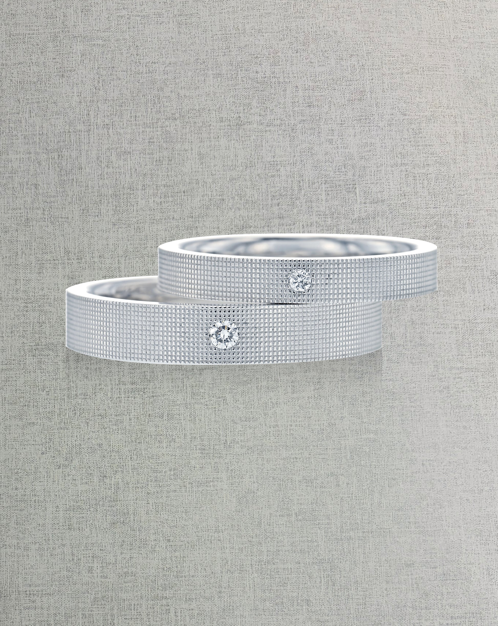 잔잔하게 반복되는 패턴 위로 빛과 그림자가 섬세하게 흐릅니다. 다이아몬드는 밴드 내부에 세팅되어 걸림 없이 편안한 착용감을 제공합니다.